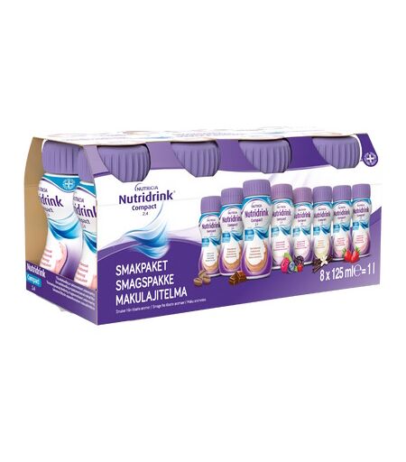 Nutridrink Compact er en fuldgyldig ernæringsdrik med en energitæthed på 2,4 kcal/ml. Indholdet i Nutridrink Compact (125 ml) svarer til næringsindholdet i en almindelig energirig ernæringsdrik (200 ml). Dette gør Nutridrink Compact særdeles velegnet til patienter, som har vanskeligt ved at drikke hele indholdet af en standard ernæringsdrik. Andre pakningsstørrelser Nutridrink Compact findes i 8 forskellige smagsvarianter: banan, jordbær, mokka, vanilje, skovbær, abrikos, chokolade og neutral. Dispenseringsform Ernæringsdrik ...