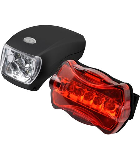 Cykellygtesæt - forlygte og baglygte Sættet består af en stærk forlygte med gummifinish, 5 hvide lysdioder og en lysstyrke på 101,20 candela samt en baglygte i god kvalitet med 5 lysdioder med en lysstyrke på 7,68 candela. Begge lygter har blink eller konstant lys, og leveres inkl. 3+2 stk. AAA batterier og holdere. ...