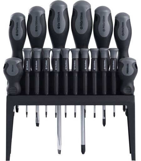 Probuilder skruetrækkersæt med 18 dele Lækkert skruetrækkersæt i egen holder, hvor skruetrækkerne altid er klar til brug i værkstedet. Skruetrækkerne er fremstillet i holdbart CRV-stål. Kommer med skridsikkert TPR-håndtag. Specifikationer: Brand: Probuilder 4 stk. Ligekærv: 8x150, 6x100, 5x75, 6x38 mm. 4 stk. Phillips: PH3x150, PH2 x100, PH1 x75, PH2 x38 mm. 6 stk. præcisions-skruetrækkere: T5, T6, T7, T8, T9, T10 x40 mm. 2 stk ligekærv: 2.0, 3.0 x40 mm. 2 stk Phillips: PH0, PH00 x40 mm. Greb: TPR Materiale: CRV-stål (Chrom Vanadium) Vægt: 0,88 kg. ...