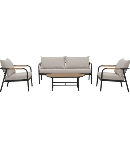 Havemøbelsæt til 4 personer Ønsker du at skabe et sted hvor dine medarbejder kan sidde og fordybe sig i det danske sommervejr på arbejdspladsen, eller blot en lækrog hvor de kan nyde kaffen i pausen så er dette sæt det ideelle sæt. Det kan også bruges til at lave en hyggekrog hjemme i den private have. Sættet består af en 2 personers sofa, to stole og to smukke borde. Farve: Sort, natur, teak Materiale: Aluminium, textilen, kork, polyester Dimensioner, sofa (BxDxH): 166 x 76 x 63 cm Dimensioner, stol (BxDxH): 67 x 76 x 63 cm Dimensioner, bord (BxDxH): 110 x 59 x 40 cm Siddehøjde: 32 cm Sædedybde: 55 cm Hyndetykkelse: 10 cm Armlænshøjde: 62 cm Stof: 220g/m2 polyester Pfas fri Bemærk, at Lomax anbefaler, at havemøblerne opbevares indendørs uden for sæsonen. ...