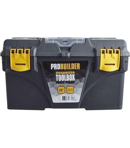 Værktøjskasse med løs indsatsbakke, lukkebeslag og nedfældeligt håndtag samt sortimentsrum i låget Praktisk medium størrelse værktøjskasse, perfekt til alt det essentielle man har behov for til arbejdsopgaverne. Specifikationer: Brand: Probuilder Materiale: PP-plast Dimensioner: 432 x 250 x 238 mm. Kasse, clips, bakke og håndtag er sort Låget er gråt Sortimentsrum i låget Lukkkebeslag i gul Vægt: 1,325 kg. ...