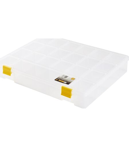 Sortimentsæske til værktøjsopbevaring eller tilbehør Sortimentsæske som er ideel til skruer, møtrikker, o-ringe og andre mindre dele. Udstyret med lukkebeslag samt transparent låg. Specifikationer: Brand: Probuilder Antal rum: 15 Kassen og låg er transparent Clipsene er gule Dimensioner: 324 x 247 x 51 mm Materiale: Plast Vægt: 0,397 kg. ...