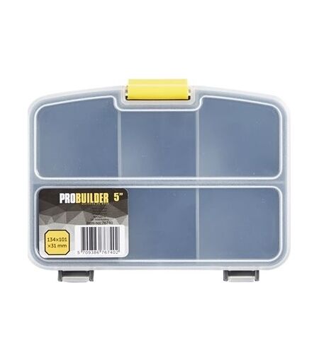Sortimentsæske til værktøjsopbevaring eller tilbehør Sortimentsæske som er ideel til skruer, møtrikker og andre mindre dele. Udstyret med lukkebeslag samt transparent låg. Specifikationer: Brand: Probuilder Dimensioner: 134 x 101 x 31 mm. Antal rum: 6 Kassen er grå og låget er transparent Materiale: PP plast (Polypropylene) Vægt: 0,062 kg. ...