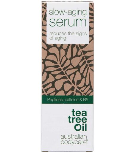 Australian Bodycare Slow-aging Serum er en ansigtsserum til moden hud med rynker. Slow-aging Serum med Tea Tree Oil, Panthenol og Koffein mindsker synligheden af fine linjer. Peptider og antioxidanter udglatter og opfrisker huden. Dosis og Anvendelse Serum skal bruges 2 gange dagligt efter rens af ansigt. Fordel et par dråber serum på den rene og tørre hud i ansigt og på hals og massér ind. ...