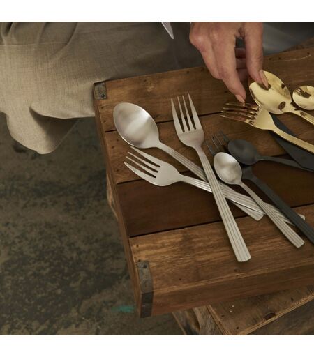 Komplet bestiksæt i 48 dele fra Raw Dette komplette bestiksæt til 12 personer er fremstillet i rustfrit stål. Bestikket har et råt og enkelt udtryk, der er som skabt til den nordiske borddækning. Bestikket er designet i samarbejde med livsstilsredaktøren Christiane Schaumburg-Müller. Bestikket er beskyttet af en PVD coating som sikrer at bestikket gang på gang kan gå i opvaskemaskinen Æsken indeholder: 12 knive, 12 gafler, 12 skeer, 12 teskeer Farve: Mat stål Materiale: Rustfrit stål Rengøring: Tåler opvaskemaskine ...