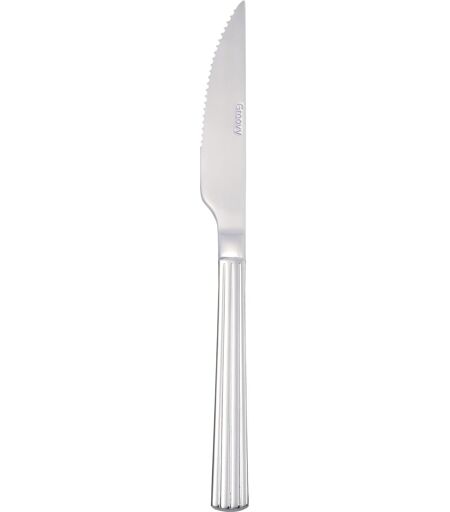 Aida Groovy Steakkniv Aida Groovy er uden tvivl et godt valg, når det daglige bord skal dækkes! Groovy bestiksættet har et eksklusivt design med en cool kant, som understreges af de horizontale riller langs skæftet og de enkelte deles relativt brede form. Det giver Aida Groovy stellet et elegant look, som er både effektfyldt og robust, uden at det bliver for tungt. Steakkniven er designet til nemt at skære igennem saftige bøffer og andre kødretter, takket være den skarpe klinge og den velafbalancerede form. Alle de enkelte dele er fremstillet af blankt rustfrit stål, hvilket sikrer både holdbarhed og et stilrent udtryk. Det gør Aida Groovy oplagt til firmaets kantine og køkkenet, når det pæne frokostbord skal dækkes. Groovy stellets enkelte dele ligger godt i hånden, og de har en behagelig tyngde, som skaber balance og gør bestikket let at bruge. Det gør Aida Groovy til en stor fornøjelse at spise med, til hverdag og fest. Blank stål Længde: 22,4 cm Tåler maskinopvask ...
