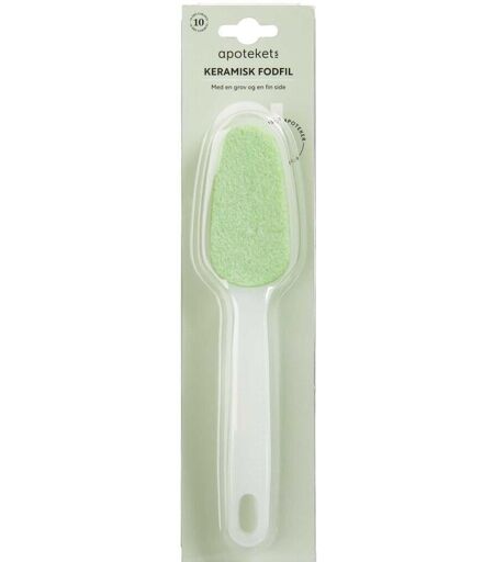 Apotekets Keramisk Fodfil er en dobbeltsidet fodfil med en ru overflade på den ene side til hård hud og en fin side til nænsom pleje. Dosis og anvendelse Specielt velegnet til diabetikere, der har større risiko for fodsår. Fodfilen kan anvendes både på tør og fugtig hud, men anbefales på våd eller fugtig hud for en nænsom anvendelse. Fodfilen kan rengøres under rindende vand med en neglebørste. ...