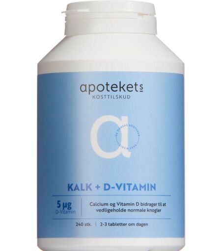 Apotekets Kalk og D-vitamin er et kosttilskud til voksne, der ikke får nok med mælkeprodukter, grøntsager og fisk gennem den daglige kost. D-vitaminen hjælper med at vedligeholde knogler, tænder og bidrager til en normal funktion af immunforsvaret og fremmer optagelsen af calcium i knoglerne. Andre pakningsstørrelser Apotekets Kalk og D-vitamin 5mikg 120 stk. Dispenseringsform Tabletter Dosis og anvendelse Den anbefalede daglige dosis for voksne og børn over 11 år er 1 tablet to-tre gange dagligt i forbindelse med et måltid. Dagsdosis bør ikke overskrides. ...