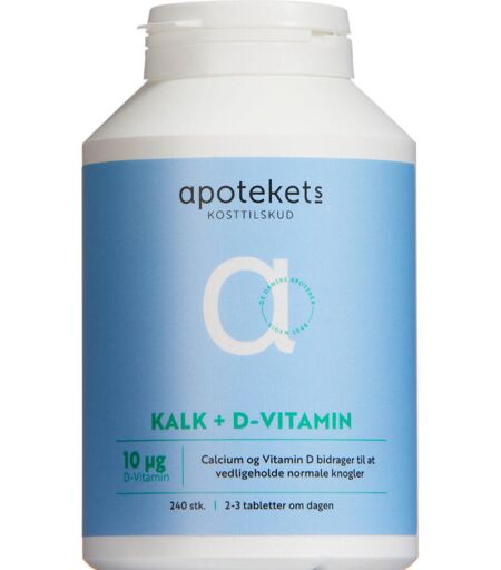 Apotekets Kalk og D-vitamin 10 µg er et kosttilskud med calcium og D3-vitamin. Kosttilskuddet sikrer ekstra tilskud af kalk og supplerer det daglige D-vitaminindtag. Produktegenskaber: Indhold pr. 2 tabletter i mængde og procent af RI (Referenceindtag): Calcium, 800 mg (100 % af RI) bidrager bl.a. til vedligeholdelse af knogler og tænder.Vitamin D3 20 mikg (400% af RI) bidrager bl.a. til et normalt calciumindhold i blodet. Velegnet til: Voksne og børn over 11 år med behov for tilskud af kalk og D-vitamin. Anvendelse: Dosis: voksne og børn over 11 år: 1 tablet 2-3 gange dagligt, i forbindelse med et måltid. Holdbarhed & opbevaring: Opbevares utilgængeligt for børn. Opbevares tørt og ved stuetemperatur. Advarsel: Kosttilskud bør ikke træde i stedet for en sund og varieret kost.Bør kun efter aftale med læge eller sundhedsplejerske anvendes til gravide eller børn under 1 år.Den anbefalede daglige dosis bør ikke overskrides. ...