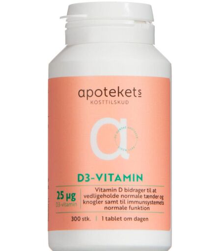 Apotekts D3-vitamin 25 mikg300 stk Apotekets D3-vitamin er et kosttilskud med 25 µg vitamin D3 (cholecalciferol) til voksne og børn fra 11 år. Vitamin D bidrager bl.a. til immunsystemets normale funktion samt til at vedligeholde normale tænder og knogler. Tablet, diameter 7 mm. Uden gelatine, mælkeprotein, laktose eller gluten. Dispenseringsform Tabletter Dosis og Anvendelse Til voksne og børn fra 11 år. Anbefalet daglig dosis: 1 tablet sammen med et måltid. Den anbefalede daglige dosis bør ikke overskrides. ...