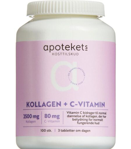 Apotekets Kollagen + C-Vitamin er et kosttilskud. Kollagen er en af hudens vigtigste byggesten. Hudens naturlige kollagenproduktion begynder at aftage i 30-års alderen, en naturlig proces. Med Apotekets Kollagen kosttilskud kan du give din krop et tilskud, der ...