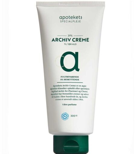 Apotekets Archiv Creme er blødgørende, fugtgivende og beskyttende creme til tør/irriteret hud, der plejer huden og medvirker til at holde den smidig. Cremen danner en beskyttende hinde på huden, nedsætter fordampningen fra huden og bidrager til at bevare hudens naturlige fugtbalance. pH-værdi: 8,0. Fedtprocent: 39%. Uden parfume. Dosis og Anvendelse Kan anvendes af både børn og voksne. Fordeles i et tyndt lag på tør/irriteret hud flere gange dagligt efter behov. ...