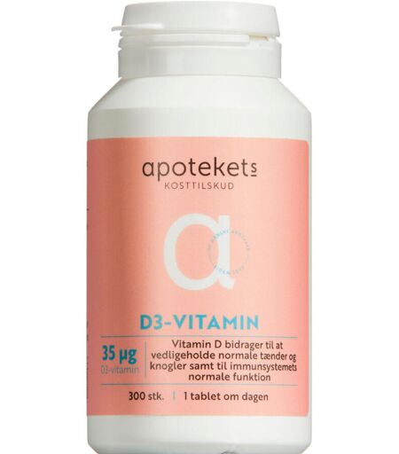 Apotekets D3-Vitamin er et kosttilskud med 35 mikg D3-vitamin (cholecalciferol) til voksne samt børn fra 11 år. Vitamin D bidrager bl.a. til immunsystemets normale funktion samt til at vedligeholde normale tænder og knogler. D-vitamin bidrager desuden til et normalt calciumindhold i blodet. Tablet er rund med en diameter på 7 mm. Uden gelatine, mælkeprotein, laktose eller gluten. Dosis og Anvendelse Anbefalet daglig dosis voksne: 1 tablet dagligt i forbindelse med et måltid. Den anbefalede daglige dosis bør ikke overskrides. ...