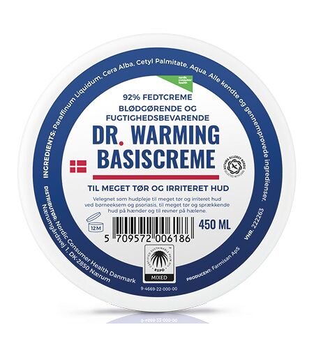 Dr. Warming Basiscreme er en creme med et fedtindhold på 92%, som blandt andet anvendes som hudpleje ved ekstrem tør og sart hud, psoriasis, atopisk eksem mm. Den er et godt supplement ved aktiv hudbehandling med lægemidler, er langvarigt fugtighedsbevarende, og den efterlader huden blød, smidig og mindre sårbar. Basiscremen ...