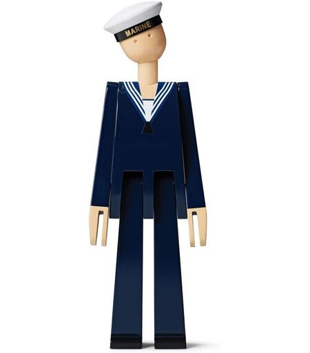 Kay Bojesen Marine H: 20,5 cm - Mørkblå/Malet bøg Tidsløs og klassisk Kay Bojesen træfigur. Figuren er inspireret af de uniformerede instanser, hvilket også ses i andre af Kay Bojesens træfigurere. Figuren er sjov og charmerende, da den kan justres alt efter om den skal stå rør eller gå i march. Figuren vil både passe ind i hjemmet børneværelse eller stue, alt efter hvad man ønsker. Figuren er FSC-certificeret og kan derfor købes med god samvittighed. Designer: Kay Bojesen Denmark Farve: Mørkeblå Materiale: Malet bøg Mål: B: 7 cm H: 20,5 cm D: 4 cm Certificeringer: FSC-certificeret ...