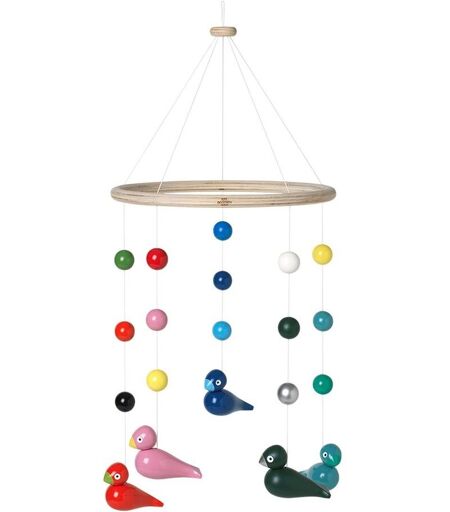 Kay Bojesen Babies Uro L: 47 cm - Multifarvet Hyggelig, smuk uro fra Kay Bojesen. Babies uroen er lavet i FSC-certificeret bøgetræ og har Kay Bojesens ikoniske sangfugle og trækugler i forskellige farver. Hæng uroen over børnesengen, puslebordet eller på børneværelset. På den måde har familiens mindste medlemmer noget dejligt og roligt at koncentrere sig på. Uroen har en diameter på 23,5 cm samt en længde på 47 cm. Uroen tåler ikke direkte sollys og ved rengøring anbefales det, at aftørre den med en tør klud. Uroen leveres i en fin gaveæske. Advarsel! Uroen skal være ude af barnets stående rækkevidde, da den kan udgøre en fare for barnet. Uroen er udelukkende til ophængning. Designer: Kay Bojesen Materialer: Malet bøg Krydsfiner Mål: Længde: 47 cm Diameter: 23,5 cm Vægt: 0,6 kg Gaveæskemål: Højde: 7,6 cm Bredde: 30 cm Dybde: 30 cm Farve: Multifarvet Vedligeholdelse: Tåler ikke direkte sollys Ved rengøring tørres uroet af med en tør klud ...