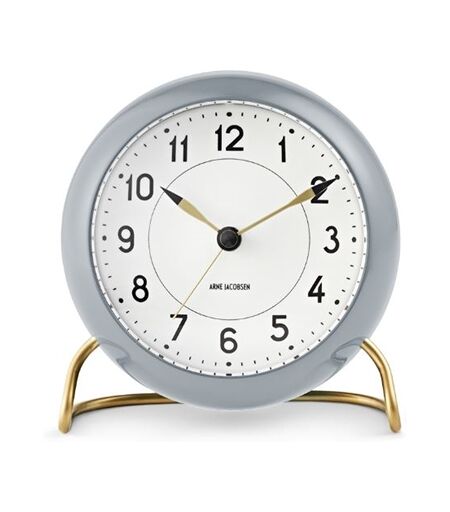 Arne Jacobsen Station Bordur Ø: 11 cm - Grå/Hvid Det smukke Station bordur fra Arne Jacobsen er fremstillet i et hærdet slagfast topglas. Station borduret har alarmfunktion, samt lys- og snooze-sensor. Arne Jacobsen har designet uret med fokus på det æstetiske og enkeltheden i at fremstille et vækkeur uden forstyrrende elementer. Tankerne bag var at få ro fra dagligdagens mobiltelefoner, som kan virke forstyrrende for nattesøvnen. Det skønne ur er perfekt til nattebordet på soveværelset eller endda på reolen i stuen, hvortil det vil fungere som en særdeles dekorativ og simpel del af indretningen. Indret dit hjem med et Arne Jacobsen bordur og giv dit hjem et præg af klassisk dansk design. Design: Arne Jacobsen Materiale: PMMA topglas, ABS plast Special IC og alarm lyd, LED lys Batteri: 2 stk. AA (medfølger ikke). Fod i IP guld rustfrit stål Mål: Ø: 11 cm H: 12 cm B: 11,3 cm D: 6,7 cm Farve: Grå Hvid ...