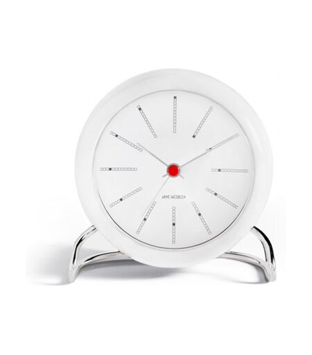 Arne Jacobsen Bankers bordur Ø: 11 cm - Hvid Det smukke Bankers bordur fra Arne Jacobsen er fremstillet i et hærdet slagfast topglas. Bankers borduret har alarmfunktion, samt lys- og snooze-sensor. Arne Jacobsen har designet uret med fokus på det æstetiske og enkeltheden i at fremstille et vækkeur uden forstyrrende elementer. Tankerne bag var at få ro fra dagligdagens mobiltelefoner, som kan virke forstyrrende for nattesøvnen. Det skønne ur er perfekt til nattebordet på soveværelset eller endda på reolen i stuen, hvortil det vil fungere som en særdeles dekorativ og simpel del af indretningen. Indret dit hjem med et Arne Jacobsen bordur og giv dit hjem et præg af klassisk dansk design. Design: Arne Jacobsen Materiale: PMMA topglas, ABS plast Special IC og alarm lyd, LED lys Batteri: 2 stk. AA (medfølger ikke). Fod i massiv rustfrit stål Mål: Ø: 11 cm B: 11,3 cm D: 6,7 cm H: 12 cm Farve: Hvid ...