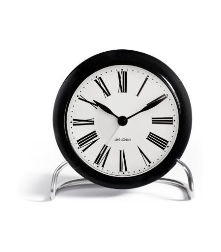 Arne Jacobsen Roman Bordur Ø:11 cm - Sort/Hvid Det smukke Roman bordur er designet af Arne Jacobsen tilbage i 1942, og i dag er det lanceret med opdaterede funktioner som vækkeur. Uret er en stilfuld brugskunst til reolen, skrivebordet eller som et klassisk islæt i herreværelset eller på natbordet. Alt i alt et smukt designikon, der med sit unikke udtryk, skiller sig ud fra andet interiør samt giver hjemmet et stilfuldt touch. Design: Arne Jacobsen Mål: Ø: 11 cm H: 12 cm B: 11,3 cm Materiale: PMMA topglas ABS plast Tekniske specifikationer: Special IC og alarmlyd LED lys Farve: Sort Hvid ...