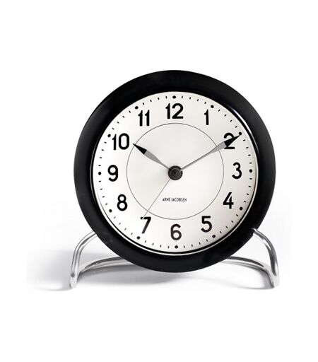 Arne Jacobsen Station Bordur Ø: 11 cm - Sort/Hvid Det smukke Station bordur fra Arne Jacobsen er fremstillet i et hærdet slagfast topglas. Station borduret har alarmfunktion, samt lys- og snooze-sensor. Arne Jacobsen har designet uret med fokus på det æstetiske og enkeltheden i at fremstille et vækkeur uden forstyrrende elementer. Tankerne bag var at få ro fra dagligdagens mobiltelefoner, som kan virke forstyrrende for nattesøvnen. Det skønne ur er perfekt til nattebordet på soveværelset eller endda på reolen i stuen, hvortil det vil fungere som en særdeles dekorativ og simpel del af indretningen. Indret dit hjem med et Arne Jacobsen bordur og giv dit hjem et præg af klassisk dansk design. Design: Arne Jacobsen Materiale: PMMA topglas, ABS plast Special IC og alarm lyd, LED lys Batteri: 2 stk. AA (medfølger ikke). Fod i massiv rustfrit stål Mål: Ø: 11 cm B: 11,3 cm D: 6,7 cm H: 12 cm Farve: Sort Hvid ...