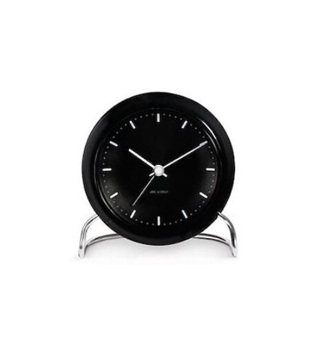 Arne Jacobsen City Hall Bordur Ø: 11 cm - Sort Arne Jacobsen har designet borduret med fokus på de æstetiske og enkeltheden i at skulle udføre en simpel væggeurs funktion uden forstyrrende elementer. Tankerne bag var at få ro fra dagligdagens mobiler som altid lyser op og kommer med lyde og som føre til uro, stress samt dårlig nattesøvn. Det er dig, og ikke mobilen, som skal lades op i soveværelset. Når du swiper din hånd hen over uret, aktiverer du automatisk det indbyggede lys. Så sæt alarmen på uret, nyd en god nats søvn, og stå frisk og veludhvilet op om morgenen. Mangler du lige at sove lidt længere, så siger vi det ikke til nogen hvis du snoozer alarmen for et øjeblik. Designer: Arne Jacobsen Materiale: PMMA topglas Plast Rustfrit stål Mål: Ø: 11 cm B: 11,3 cm H: 12 cm D: 6,7 cm Farve: Sort ...