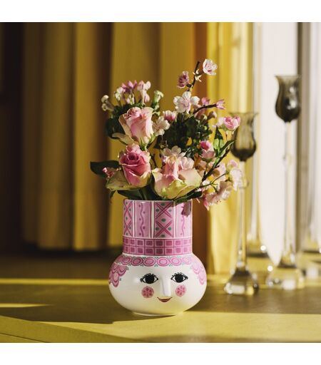 Luk farverne ind og lad Bjørn Wiinblads Olga blomstre Med sit glade smil, de blussende kinder og farverige dekorationer rummer Olga på alle måder essensen af Bjørn Wiinblad som person og kunstner – også når hun tager form som vase. Glad og drømmende skaber hun liv og personlighed i indretningen med sit poetiske udtryk og sine sprudlende farver. Vasen er en nyfortolkning af en ikonisk vase, som Bjørn Wiinblad lavede i samarbejde med den keramiske fabrik Nymølle. Den har den samme cylindriske top som vasen fra Bjørn Wiinblads imponerende designarkiv og prydes af et sødt rundt ansigt med de mandelformede øjne og den ikoniske trekantede næse. Lad Olga stå alene som et smukt centerpiece eller med en flot buket. Materiale: Keramik Farve: Pink Højde: 15 cm ...