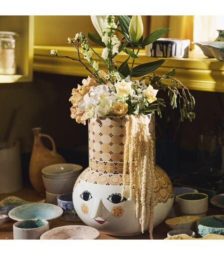 Luk farverne ind og lad Bjørn Wiinblads Olga blomstre Med sit glade smil, de blussende kinder og farverige dekorationer rummer Olga på alle måder essensen af Bjørn Wiinblad som person og kunstner – også når hun tager form som vase. Glad og drømmende skaber hun liv og personlighed i indretningen med sit poetiske udtryk og sine sprudlende farver. Vasen er en nyfortolkning af en ikonisk vase, som Bjørn Wiinblad lavede i samarbejde med den keramiske fabrik Nymølle. Den har den samme cylindriske top som vasen fra Bjørn Wiinblads imponerende designarkiv og prydes af et sødt rundt ansigt med de mandelformede øjne og den ikoniske trekantede næse. Lad Olga stå alene som et smukt centerpiece eller med en flot buket. Materiale: Keramik Farve: Beige Højde: 35 cm ...