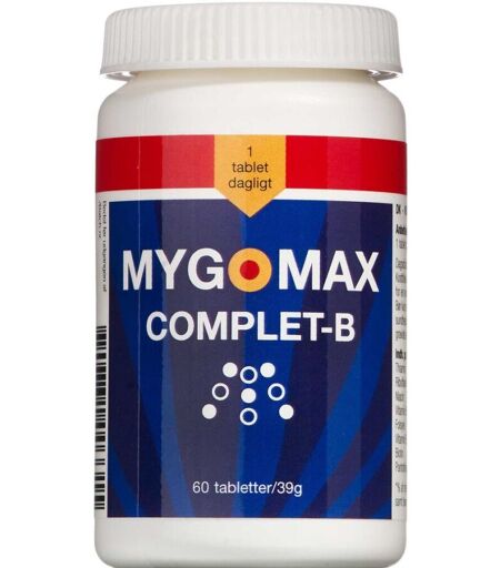 Mygomax Complete-B er et kosttilskud. Erfaringer viser, at hvis man er plaget af myg, afhjælper Mygomax med dette. Andre pakningsstørrelser - Dispenseringsform Tabletter Dosis og anvendelse Den anbefalede dosis er 1 tablet dagligt. Dagsdosis bør ikke overskrides. ...