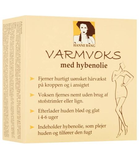 Hanne Bang Varmvoks er en klassisk voks som skal varmes op. Den er særligt velegnet til hårfjerning i ansigtet og til andre særligt følsomme steder på kroppen, fx armhulerne og i bikinilinien. Voksen kommer i en lille gryde, som skal opvarmes på en kogeplade. Voksen indeholder hybenolie. der er kendt for sin fugtgivende virkning. Hydenolie indeholder bl.a A-vitamin og C- vitamin, der har en plejende effekt på huden. Denne voks kan fjernes uden brug af stofstrimler eller lign. Indeholder: 1 stk. gryde med 100 g voks 1 stk. spatel Fordele: Klassisk varmvoks Velegnet til hårfjerning på følsomme steder Indeholder hybenolie Plejer og fugter Er mild og skånsom mod huden Efterlader huden silkeblød Kan fjernes uden brug af stofstrimler eller lign. Fjerner hår ned til 4 mm Anvendelse: Følg brugsanvisningen meget nøje Bruges på ren og tør hud Smelt voksen i gryden Påfør et jævnt lag voks med spatlen Når voksen er kølet af, løfter du forsigtigt i et hjørne og rykker herefter resten af voksen af Efter behandling kan huden være ekstra følsom. Du bør derfor ikke anvende cremer eller lign. der indeholder parfume eller alkohol OBS: Læs brugsanvisningen og følg alle instruktioner meget nøje, før brug! ...