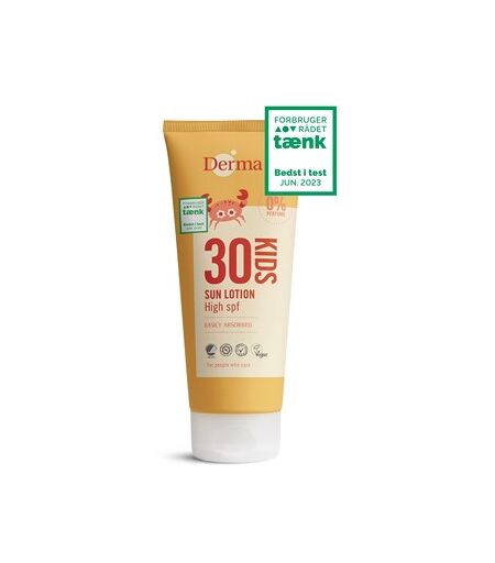 Derma Sun Kids Sollotion SPF30 er en allergivenlig og meget vandfast solcreme med høj solbeskyttelse. Den er udviklet specielt til børn og voksne med sart hud og lever op til EU-anbefalinger om optimal UVA- og UVB-beskyttelse. Solcremen trænger hurtigt ind i huden uden at fedte. Solcremen er både Svanemærket, AllergyCertified og anbefalet af Asthma Allergy Nordic og helt fri for parfume og anden unødig kemi. ...