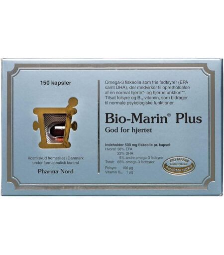 Bio-Marin er et kosttilskud, som er godt for hjerte og hjerne. Letoptagelig: Eneste fiskeolieprodukt i Danmark med frie fedtsyrer. Højkoncentreret fiskeolie-produkt med et indhold af omega-3 fedtsyrer på 65%. Synkevenlig kapselstørrelse. Raffineret (tre-trins raffineringsproces, hvor olien bliver grundigt renset). Ren: Meget ren fiskeolie som ligger langt under myndighedernes grænseværdier for forurening. Kombineret med vitaminerne B12 og folsyre, der bidrager til et normalt homocystein-stofskifte, et normalt immunforsvar samt normale psykologiske funktioner. Kontrolleret: Fremstillet under farmaceutisk kontrol. Andre pakningsstørrelser - Dispenseringsform Kapsler Dosis og anvendelse 1-4 kapsler dagligt for voksne samt børn på 11 år og derover, afhængigt af hvor meget fisk, der i øvrigt konsumeres. Synkes hele. Den anbefalede daglige dosis må ikke overskrides. ...