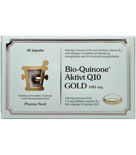 Bio-Quinone Aktivt Q10 Gold kapsler 90 stk. Bio-Quinone Q10 er et kosttilskud, som er med til at reducere træthed, energiløshed og til et normalt energistofskifte. Dispenseringsform Kapsler Dosis og anvendelse 1 kapsel dagligt i forbindelse med et måltid. Den anbefalede daglige dosis må ikke overskrides. ...