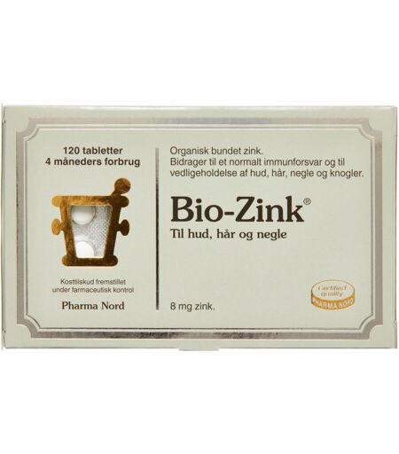 Bio-Zink Tabletter bidrager til et normalt immunforsvar og til vedligeholdelse af hud, hår, negle og knogler. Dispenseringsform Tabletter Dosis og Anvendelse Anbefalet daglig dosis: 1 tablet for voksne og børn fra 11 år. Dagsdosis bør ikke overskrides. ...