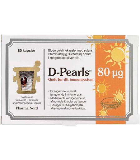 D-pearls er bløde gelatinekapsler med solens vitamin (80 mikg D-vitamin) opløst i koldpresset olivenolie. D-pearls er gode for immunsystemet og bidrager til et normalt fungerende immunforsvar. Medvirker til vedligeholdelse af normale knogler og tænder. Bidrager til vedligeholdelse af en normal muskelfunktion. Dispenseringsform Kapsler Dosis og anvendelse 1 kapsel dagligt for voksne samt børn fra 11 år. Kapslen sluges hel eller bides over. Den anbefalede daglige dosis bør ikke overskrides. ...