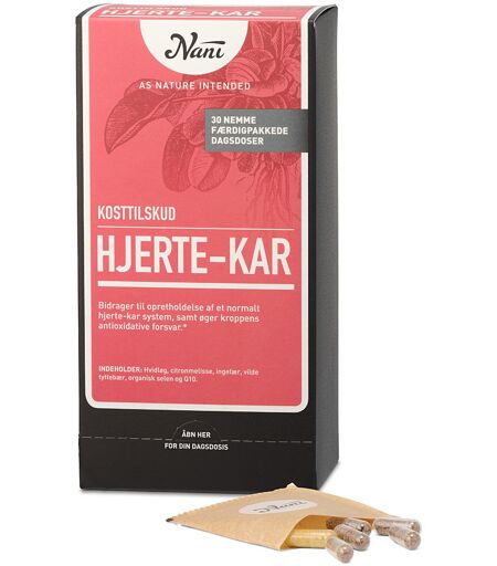 Nani Kurpakke Hjerte-kar er et innovativt kosttilskud med udvalgte urteekstrakter, tyttebær, organisk selen og Q10 i praktiske dagsdoser. Til vedligeholdelse af et sundt hjerte-kar system. Dispenseringsform Kapsler. ...