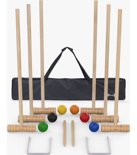 Kroket Dette er en luksusudgave af kroket lavet af Stanlord, som er et dansk mærke der lægger vægt på kvalitet og finish. Det er fremstillet i gummitræ og fyrretræ, som er kendt for sin evne til at modstå forskellige vejrforhold og høj slagstyrke. Inkluderet: 6 x Mallets 100x3cm i fyrretræ 6 x Mallet hoveder 23x6cm i gummitræ 6 x Kugler D8,5cm gummitræ 2 x Målindsats 23cm 10 x Bøjler i metal 17x28cm 1 x stilfuld Oxford opbevaringstaske Spilleregler på dansk, svensk, norsk og finsk. Vægt: 8,5 kg ...