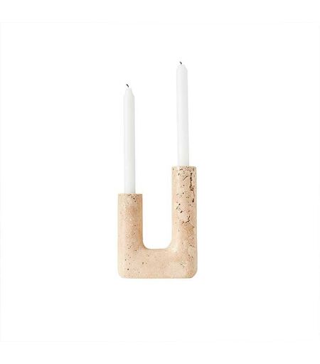 MUUBS Minerva Lysestage H: 20 cm - Creme Den smukke Minerva lysestage fra MUUBS har to arme, skarpe linjer og rundede hjørner og er lavet af naturstenen travertine, som består af kalksten. Det giver lysestagen et elegant farvespil. Lysestagens overflade er glat men kan have små unikke kendetegn og fordybninger som hylder den unikke natur som stenen er skabt i. Minerva er opkaldt efter den romerske mytologis gudinde af samme navn. Navnet er et symbol på visdom, men var også en støtte for kunsten, handel og håndarbejde. Stearinlys skal tilkøbes. Da lysestagen er fremstillet af natursten, vil hver lysestage variere en smule i farve og mønster, og dermed være unik. Designer: MUUBS Materialer: Travertine Mål: Højde: 20 cm Bredde: 14,5 cm Farve: Creme ...