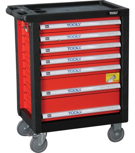Professionel værkstedsvogn med en masse lækre detaljer Tooly værkstedsvogn er utrolig praktisk og holdbar. Den letter arbejdet og har god plads til en masse værktøj. Vognen er konstrueret i pulverlakeret stål, har perforerede sider og udstyret med kvalitets håndtag i aluminium til skufferne. Tooly er udstyret med 2 faste og 2 drejelige hjul med bremse, som gør det nemt og sikkert at flytte vognen rundt. Skufferne varierer i størrelse og giver rigtigt gode opbevaringsmuligheder. I vognen er indbygget en centrallås, som gør det muligt at låse skufferne og samtidig forhindrer, at skufferne går op af sig selv. Derudover følger en non-slip måtte med til hver skuffe, som skåner både værktøj og vogn og sikrer, at værktøjet ligger godt og ikke rasler rundt. Vognens 4 hjørner er beskyttet af bumbers, som tager stød og slag og skåner vognen. Topbakken er udført i ABS plast og udgør en god aflægnings plads. En super praktisk værkstedsvogn som er helt ideel på værkstedet. Specifikationer: Kapacitet: 300 kg. - max. 30 kg. i de små skuffer og 35 kg. i de store skuffer. Perforerede sider med 9x9 mm huller Fuldt udtrækkelige skuffer på kuglelejer Bredde: 550 mm (Indvendig bredde: 545 mm) Dybde: 407 mm (Indvendig dybde: 395 mm) 5 x højde 65 mm 1 x højde 135 mm 1 x højde 204 mm Centrallås inkl. 2 nøgler 2 faste og 2 drejelige hjul heraf 1 stk. med bremse Mål (LxbxH): 675x453x965 mm Vægt: 62 kg ...