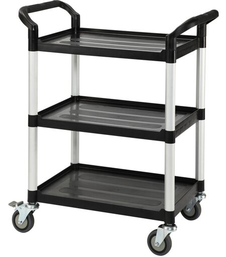 Rullebord Alumniumsrør og hylder i plast Mål (LxBxH): 80x48x100 cm Hyldestørrelse: 60,7 x 43,5 cm Afstand mellem hylder: 27,5 cm Kapacitet: 210 kg 4 massive gummihjul – 4 drejelige heraf 2 med bremse Vægt 10,5 kg Affaldsspand kan tilkøbes Leveres usamlet ...