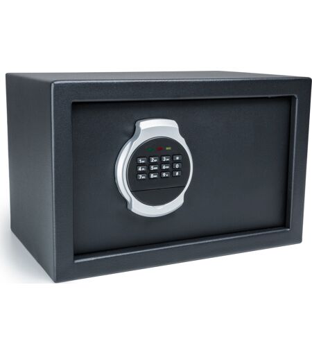 Værdiboks 8 liter m. kodelås Enkeltvægget sikkerhedsskab med et klassisk og enkelt design. Værdiskabet fylder ikke meget og giver en sikker opbevaring af værdigenstande, dokumenter og personlige ejendele. Skabet har en flot pulverlakeret overflade i antracit og et tidløst design. En værdiboks som ligefrem pynter og passer godt ind på ethvert kontor og i ethvert hjem. Udstyret med en hylde. Konstruktion Værdiboksen har en solid stål konstruktion og har en vægtykkelse på 1,5 mm, en låge på 3 mm og 2 solide låsebolte. Fastboltning Værdiskabet er forberedt for fastboltning i både ryg og bund og sikrer at en eventuel tyv ikke løber bort med hele boksen. Bolte medfølger. Lås Værdiboksen er udstyret med en brugervenlig kodelås i et flot design, som nemt betjenes. Derudover er skabet udstyret med en mekanisk lås til nødstilfælde. Nødlås og batterier medfølger. Specifikationer: Udvendige mål (HxBxD): 200x310x200 mm Indvendige mål (HxBxD): 197x307x140 mmKapacitet: 8 liter Vægt: 5 kg Kodelås, inkl. nødnøgle - 4xAA batterier Forberedt for fastboltning i ryg og bund (bolte medfølger) Farve: Antracit ...