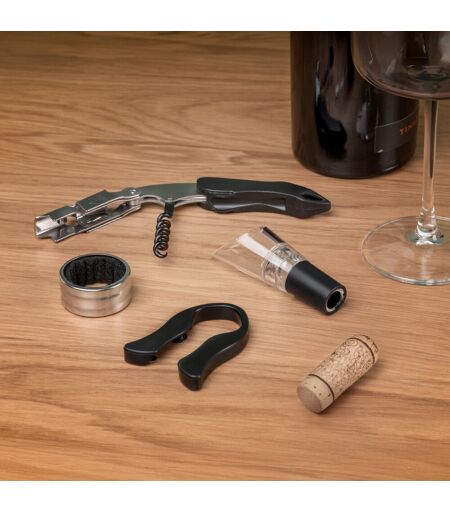 Opgrader vinoplevelsen med dette lækre sæt Sættet indeholder: Tjenerproptrækker – En professionel proptrækker, designet til let og effektiv åbning af vinflasker, med både folieskærer og oplukkerfunktion. Vinilter skænkeprop – Forbedrer smagen af din vin ved at ilte den, mens du hælder, så alle smagsnoter fremkommer. Folieskærer – Gør det nemt at fjerne folien fra flaskens top, så du hurtigt kan komme til proppen. DrypStop krans – Placeres rundt om flaskehalsen for at forhindre dryp og holde bordet rent. ...