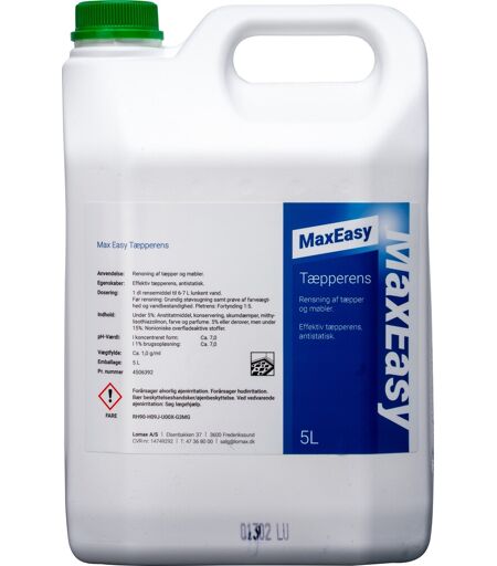 Max Easy Tæpperens Tæpperens fra Max Easy er et effektivt og koncentreret rengøringsmiddel til rensning og rengøring af tæpper og møbler. Rensemidlet er antistatisk og smudsafvisende og løsner snavs og fedtstoffer fra tæppets eller møbelstoffets fibre, så du opnår et rent og pænt resultat. Indhold: 5 L Til rengøring og rensning af tæpper og møbler Dosering: 1 dl til 6-7 L lunkent vand Lavtskummende Antistatisk og smudsafvidende pH-værdi: 7,0 Effektiv rensning af tæpper og møbler Før rensning anbefales det at man sikrer en grundig støvsugning af tæppet eller møblet, hvorefter det er vigtigt at teste farveægtheden og vandbestandigheden, så rensningen foretages korrekt. Tæpperensen er effektiv til manuel tæpperensning, men indeholder samtidig en skumdæmper, hvilket gør rensen lavtskummende, så den også med fordel kan anvendes i tæpperensningsmaskiner. ...
