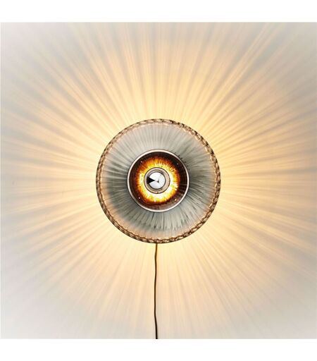 Design By Us New Wave Optic Wall XL Ø: 38 cm - Smoke/Black Unik og stilfuld væglampe fra Design By Us. Med den elegante New Wave Optic lampe kan du opnå et betagende lys, som vil vække beundring hos beskueren. Lampen er udført i mundblæst glas udformet som fine bølger, der skaber klare associationer til de velkendte retrolamper i mønstret glas. Når lampens lys tændes, kastes et smukt bølget lys på væggen, hvilket er med til at skabe et iøjnefaldende spil mellem lys og skygge i rummet. Med lampens skulpturelle udtryk vil den fremstå som et lille kunstværk i sig selv, selv når lampen ikke er i brug. Sammen med lampens smukt farvet glas kombineret med sølvfarvede detaljer i form af den håndmalet kant af lampens åbning såvel som den klassiske sorte base vil denne belysningsløsning tilføre elegance til indretningen. Brug New Wave Optic lampen som en smuk sengelampe, i entréen til at skabe en varm velkomst eller i stuen som hyggelig belysning. Du kan med fordel kombinere flere New Wave Optic væglamper for at opnå en komplet kunstinstallation på væggen. New Wave Optic fås både som væglampe og pendel, ligesom lampen også kommer i flere størrelser såvel som farver. Som en smuk tilføjelse til lampen kan Eyeball, som er en tilbehørsdel til New Wave Optic serien, tilkøbes. Med Eyeball, der har en unik, bølget form i glas, kan du forstærke den bølgende lyseffekt fra New Wave Optic lampen og dermed skabe endnu mere blikfang med elegant lys. OBS: New Wave Eyeball eller pære medfølger ikke. Miljøbillederne viser lampen både med og uden Eyeball. Da lampens glasskærm er mundblæst og derfor unik, kan der muligvis forekomme luftbobler på op til 0,5 cm. Designer: Rasmus Larsson Materiale: Mundblæst glas Belagt aluminium Tekstilledning Mål: Ø: 38 cm D: 18 cm Ledningens længde: 200 cm Vægt: 2,4 kg Tekniske specifikationer: Kun til indendørs brug Lyskilde: E27 Max 40W (medfølger ikke) ...