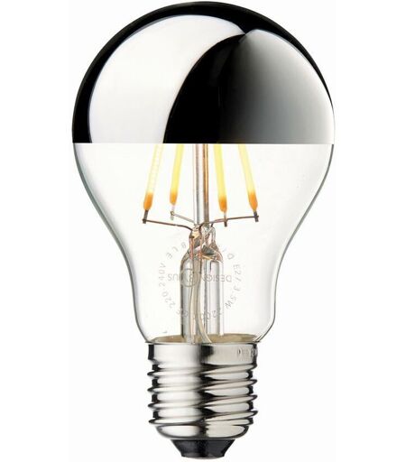 Design By Us Arbitrary Bulb Ø60 Crown E27 3,5W LED Dimmable H: 10,8 cm - Silver Smuk LED pære fra Design By Us. Denne pære passer til New Wave Wall lamper fra Design By Us. Med denne pære kan du udnytte det fulde potentiale af din Design By Us lampe ved at lade en smuk lyskilde skinne gennem farvet såvel som klar glas. Den topforspejlede pære gør det muligt at placere den synligt i en lampe, uden at den blænder, ligesom pærens sølvfarvede top tilfører en dekorativ detalje til lampens samlede udtryk. Med Arbitrary Bulb opnår man derfor behagelig og hyggelig belysning, som samtidig skaber en flot refleksion ud i rummet. Pæren giver et varmt lys og kan dæmpes på praktisk vis. OBS: Lampen medfølger ikke. Miljøbillederne viser ikke denne vares reelle farve, men det viser dens udformning samt mulige anvendelse. Producent: Design By Us Mål: H: 10,8 cm Ø: 6 cm Vægt: 35 g Lysegenskaber: Sokkel: E27 Farvetemperatur: 2700 Kelvin Nominel lysstrøm: 245 Lumen Strømforbrug: Wattforbrug: 3,5W Tekniske specifikationer: Dæmpbar ...
