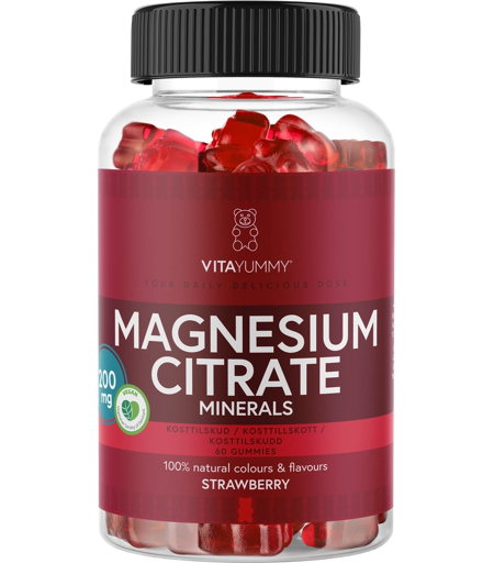 VitaYummy Magnesium Citrate Strawberry er et kosttilskud til voksne i form af små velsmagene vingummibjørne. Bamserne indeholder magnesium citrat fra citronsyre, der findes i naturlige planter. Magnesium bidrager til at mindske træthed og udmattelse, bidrager til en normal muskelfunktion, bidrager til vedligeholdelse af normale knogler og normale tænder. Den lækre smag kommer fra jordbær og den flotte naturlige farve kommer fra gulerod og græskar. VitaYummy er vegansk og fri for kunstige farve-, smags- og sødestoffer. En perfekt mulighed til dig der gerne vil have et tilskud af magnesium, men som ikke bryder sig om at sluge piller. Fordele: Kosttilskud Til voksne Vingummier Perfekt til dig der ikke kan lide at sluge piller Daglig dosis: 3 stk om dagen Til voksne og børn over 11 år Ingrediensliste: Magnesium 200 mg OBS: Opbevares tørt, ved stuetemperatur og uden direkte sollys. Opbevares utilgængeligt for børn. Den daglige dosis må ikke overskrides. Kosttilskud bør ikke træde i stedet for varieret kost. Bør kun efter aftale med læge eller sundhedsplejerske. ...