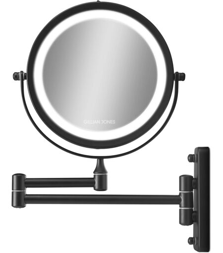 Gillian Jones Wall Mirror W/ Arm og Lights- Black er et super funktionelt og praktisk spejl, som er udviklet med et indbygget og rundt LED lys, for at give det bedst mulige spejlbillede. Spejlet er nemt at montere på væggen, og den indbyggede 'arm' gør så man kan trække spejlet op til 31 cm. ud, samt sætte det helt ind til væggen når man ikke bruger det. Spejlet er dobbeltsidet med 1x forstørrelse på den ene side og 10x forstørrelse på den anden, og kan roteres 360 grader. Med dette spejl er det meget lettere at lægge den perfekte makeup, hvor man kan præcisere selv de mindste detaljer. Detaljer: Spejl Mat sort Indbygget LED lys Nem at montere på væggen Kan trækkes ca. 31 cm ud fra væggen Dobbeltsidet med 1x og 10x forstørrelse Kan roteres 360 grader 17,5 cm. i diameter Skal bruge 4 x AAA baterier (medfølger ikke) ...