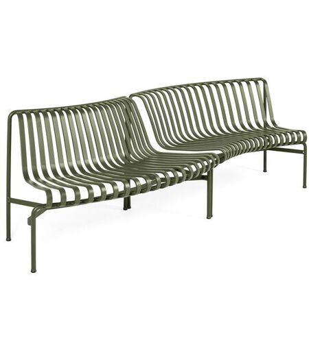 HAY Palissade Park Dining Bench In-Out Starter Set/Set Of 2 L: 283 cm - Olive Funktionel og smuk bænk fra Hay, Palissade serien. Bænken kommer i et sæt af to og er en modul bænk, til udendørs brug. Bænker kommer i to forskellige varianter, som buer hver deres vej, en der buer udad og en der buer indad. I dette sæt får du en af hver. Med disse forskelligt buede moduler kan du derfor ved sammensætning, skabe en slangeformet, lang bænk, eller benytter dem der buer samme vej for, at skabe en rund bænk med enten sæderne indvendig eller udvendig. Bænkene er perfekt til offentlig brug i parker, store haver eller hvor der ellers er brug for mange siddemuligheder. Du kan dog også sagtens bruge bænkende privat, i haver eller på terrassen. Designer: Ronan & Erwan Bouroullec Materialer: Pulverlakeret stål Mål: L: 283 cm B: 97 cm H: 80 cm ...