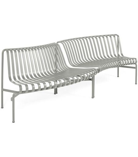 HAY Palissade Park Dining Bench In-Out Starter Set/Set Of 2 L: 283 cm - Sky Grey Funktionel og smuk bænk fra Hay, Palissade serien. Bænken kommer i et sæt af to og er en modul bænk, til udendørs brug. Bænker kommer i to forskellige varianter, som buer hver deres vej, en der buer udad og en der buer indad. I dette sæt får du en af hver. Med disse forskelligt buede moduler kan du derfor ved sammensætning, skabe en slangeformet, lang bænk, eller benytter dem der buer samme vej for, at skabe en rund bænk med enten sæderne indvendig eller udvendig. Bænkene er perfekt til offentlig brug i parker, store haver eller hvor der ellers er brug for mange siddemuligheder. Du kan dog også sagtens bruge bænkende privat, i haver eller på terrassen. OBS: miljøbillederne viser ikke nødvendigvis bænken i dens rigtige farve, men dens udformning og mulige anvendelse Designer: Ronan & Erwan Bouroullec Materialer: Pulverlakeret stål Mål: L: 283 cm B: 97 cm H: 80 cm ...