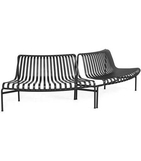 HAY Palissade Park Dining Bench Out-Out Starter Set/Set Of 2 L: 275,5 cm - Anthracite Funktionel og smuk bænk fra Hay, Palissade serien. Bænken kommer i et sæt af to og er en modul bænk, til udendørs brug. Bænker kommer i to forskellige varianter, som buer hver deres vej, en der buer udad og en der buer indad. I dette sæt får du et sæt af to der buer udad. Med disse forskelligt buede moduler kan du derfor ved sammensætning, skabe en slangeformet, lang bænk, eller benytter dem der buer samme vej for, at skabe en rund bænk med enten sæderne indvendig eller udvendig. Bænkene er perfekt til offentlig brug i parker, store haver eller hvor der ellers er brug for mange siddemuligheder. Du kan dog også sagtens bruge bænkende privat, i haver eller på terrassen. Designer: Ronan & Erwan Bouroullec Materialer: Pulverlakeret stål Mål: L: 275,5 cm B: 107 cm H: 80 cm ...
