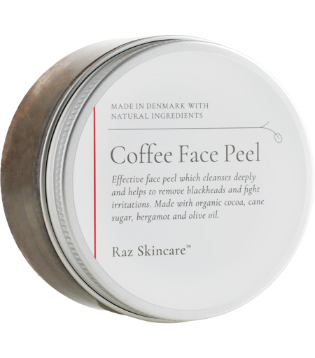 Raz Skincare Coffee Face Peel er en yderst effektiv ansigtspeeling, som opløser døde hudceller, stimulerer blodcirkulationen, mindsker porestørrelsen og reducerer produktionen af talg. Denne peeling er fyldt med kaffesyre, frugtsyre og olie, som sammen med små korn og glykolsyre eksfolierer huden, og trænger virkelig dybt ned i porerne, og efterlader huden med en smuk glød. Indholdet af E-vitamin binder fugten i huden, hvilket er med til at genoprette beskadiget hud og lindrer akne. E-vitamin er desuden en effektiv antioxidant, som er god til at holde huden ung, da den reducerer cellenedbrydningsprocessen ved oxidering. Derudover er scrubben beriget med kakao-antioxidanter, som gør huden mere modstandsdygtig og glat, da den er rig på antioxidanter, som hæmmer hudens aldringsprocesser, og forebygger både beskadigelse af cellerne og inflammation. Raz Skincare Coffee Face Peel er en utrolig effektiv peeling, som er særligt god til normal og fedtet hud. Hvis du ønsker en mere mild peeling, kan du med fordel prøve RAZ Skincare Orange Face Peel Fordele: Peeling Opløser effektivt døde hudceller Stimulerer blodcirkulationen Mindsker porestørrelsen og reducerer produktionen af talg Genoprette beskadiget hud og lindrer akne Hjælper med at gøre huden glat og blød Giver en strålende glød Renser grundigt i tilstoppede porer Til normal og fedtet hud Økologisk Vegansk Anvendelse: Anvendes 2-3 gange om ugen Bruges på fugtet hud Masseres ind i huden med cirkulære bevægelser Skyl af med vand Ingrediensliste: Sucrose. Coffea Arabica Fruit Powder. Olea Europea Fruit Oil. Carthamus Tinctorius Seed Oil. Theobroma Cacao Fruit Powder. Tocopherol. Hydroxypinacolone Retinoate. Phenoxyethanol. Citrus Bermiga Peel Oil Expressed. Cedrus Deodra Wood Oil. Dimethyl Isosorbide. Citrus Aurantium Dulcis Peel Oil Expressed. Parfum. Limonene. Linalool. ...